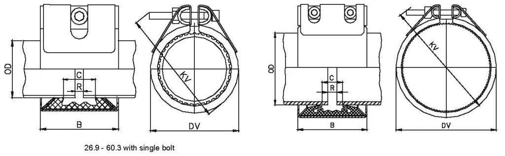 Vinidex Code - EPDM | Vinidex Code - NBR | Pipe OD (mm) | Clamping Range (mm) | PS Bar | B (mm) | C (mm) | DV (mm) | KV (mm) | Pipe Gap with Strip Insert (mm) | Torque rate Nm | Allen Head (mm) |