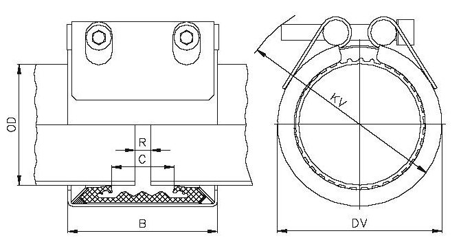 Vinidex Code - EPDM | Vinidex Code - NBR | Pipe OD (mm) | Clamping Range (mm) | PS Bar | B (mm) | C (mm) | DV (mm) | KV (mm) | Pipe Gap with Strip Insert (mm) | Torque rate (Nm) | Allen Head (mm) |