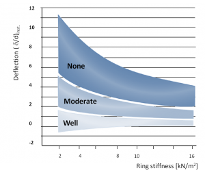 Under general gravity drainage pipe laying conditions, detailed calculations predicting pipe performance are not necessary. Following an extensive study of installed pipe performance, the European Plastic Pipe and Fitting Association (TEPPFA) concluded that the final deflection of pipes was controlled by the settlement of the soil after installation. Where installation was controlled, or self-compacting granular material were used, pipe deflections were consistently low regardless of installation depth and traffic or other loads. In the graph below, “Well” compacted refers to Standard Proctor of >94% and “Moderate” compaction refers to Standard Proctor of 87-94%.